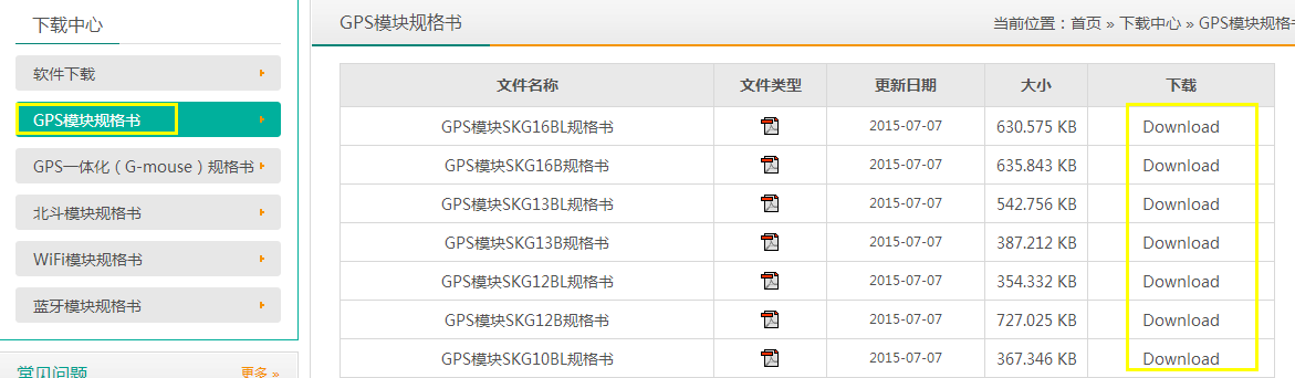 我们的网站不管是GPS模块还是WiFi模块或者是蓝牙4.0ble模块,每个模块介绍的页面上都可以下载相对应的规格书。规格书在哪里呢?有没有注意到产品图右边的绿色小按钮?如图: