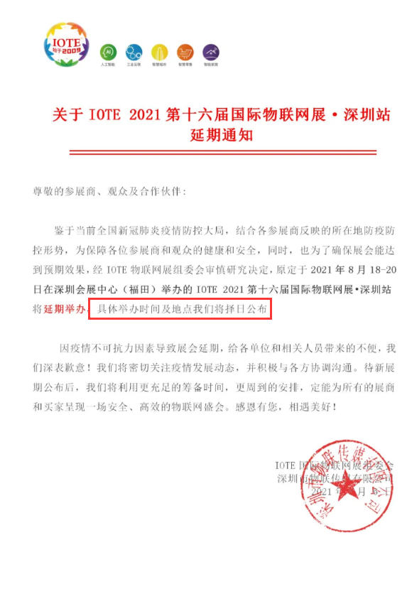 接IOT国际物联网展组委会通知,因疫情不可抗力因素导致展会延期,原定于2021年8月18-20日在深圳会展中心(福田)举办的IOTE 2021第十六届国际物联网展•深圳站将延期举办,待新展期公布后,作为参展商的SKYLAB也将第一时间告知各位!