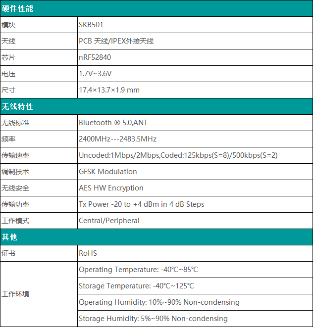 SKB501是SKYLAB基于Nordic nRF52840方案研发推出的工作温度为-40~85℃的工业级BLE5.0蓝牙模块,-20~8dBm的可调发射功率,-96dBm的接收灵敏度,1Mbps的数据传输速率,100米的连接距离以及稳定可靠的产品性能,让SKB501在数据采集及数据传输中都有较好表现。且模块集成度高,17.4*13.7*1.9(mm)的小尺寸、贴片封装,支持主、从、一主多从、主从一体等工作模式,支持GPIO/TWI/SPI/UART/ADC等接口,使蓝牙模块的应用更加灵活,支持二次开发等优点,让SKB501能更好的嵌入到客户产品中。可广泛应用于高级可穿戴设备,虚拟和增强现实、智能家居和工业以及IoT物联网设备中,同时满足客户对低功耗、远距离、高速率的数据透传需求。