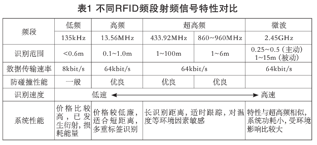 RFID常用频段包括:低频、高频、超高频、微波。针对室内定位系统,将不同频段的射频信号进行对比,结果如表1所示。
