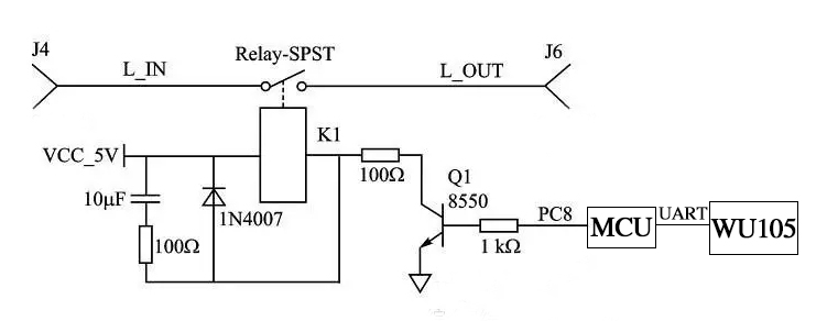 MCU收到WU105模块传过来的合上指令,PC8端口输出高电平,Q1导通,继电器的线圈有电流流过,继电器的触点L_IN和触点L_OUT吸合,插座供电给负载;