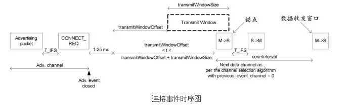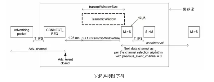 因此,在CONNECT_REQ之后,第一个由master发送到slave的数据帧,我们称之为“锚点”(如图3所示),因为之后的所有的连接事件都以这一时刻为基准,呈现周期性变化。从红色框图中我们可以看到,第一个数据帧的时刻不能早于(1.25ms+transmitWindowOffset),同时也不能晚于(1.25 ms + transmitWindowOffset + transmitWindowSize)。