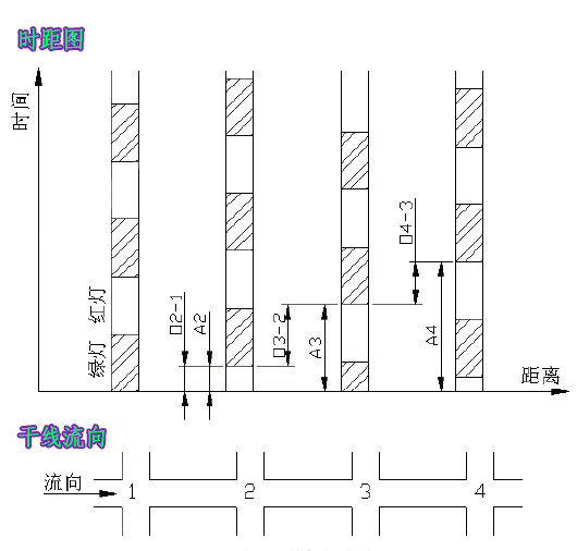 通过时距图可以对相位差进行详细的说明明,如图1所示,设路口1位基准路口,相位差以绿灯起点时间计算,则路口2的绝对相位差是A2,路口3的 绝对相位差是A3,路口4的绝对相位差是A4。显然,基准路口的绝对系那个味差是0.相对相位差 则与基准路口无关,例如 路口2相对路口1的相对差为O2-1,路口3相对于路口2的相对相位差为O3-2,路口4相对路口3的相位系那个味差为O4-3。他们之间的关系如下: