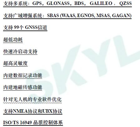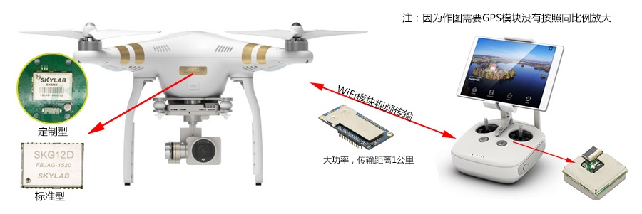 在无人机的起飞,航行,悬停,返回的任何一个阶段,都需要我们的GPS模块(SKM66定制型,SKG12D标准型)进行实时定位。无人机飞行的过程中,我们的WiFi模块SKW77进行传输视频,可传输1公里。当我们的遥控器在飞行过程中移动位置,想让无人机返航后回到移动后的位置。这时只需要在遥控器中内置GPS模块SKM56。