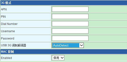 3)“广域连接模式”中选取连接至广域网络的方式有 ADSL、L2TP、PPTP、3G几种方式,在此重点介绍一下 3G 模式;