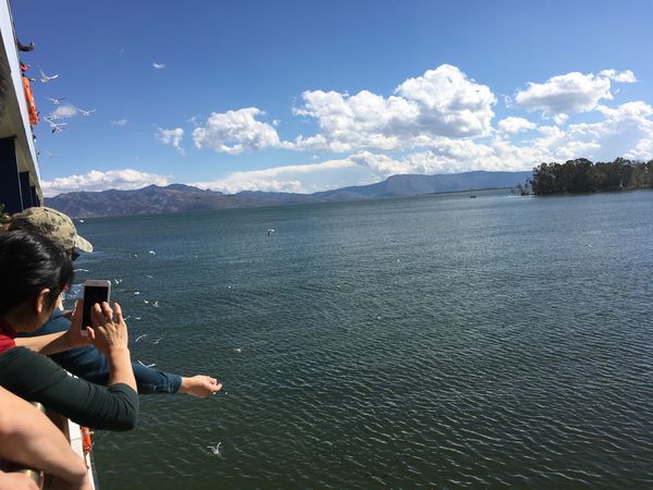 在洱海上喂食海鸥,看它们争相抢食