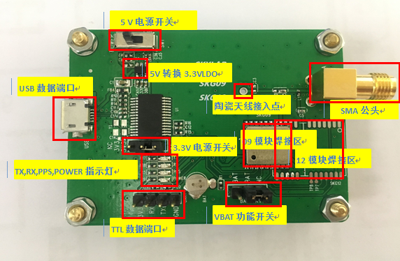 准备好电脑、GNSS模块(SKG09D)、EVB板、GPS天线、Micro USB电源线,根据《GNSS Skylab SKG12&09 EVB使用说明V1.02》,给焊接在EVB板上的GNSS模块(SKG09D)正确供电。根据示例图,接好模块天线,有源天线需正确供电;