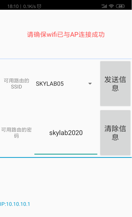 4、打开AP配网APP,点击可用路由SSID字样即可搜索出附近的热点,点击下拉选框选择欲连接的热点,输入pwd,随后点击发送信息;