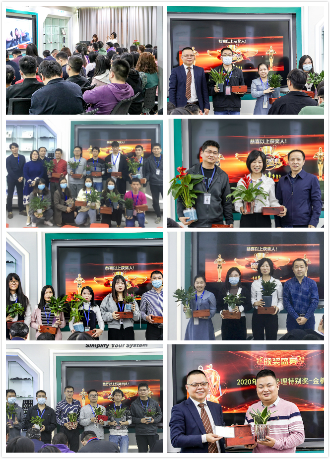 2020年的表彰大会共设7个奖项,奖项分别为:公司优秀员工——金竹奖、优秀新人——春笋奖、优秀导师——园丁奖、优秀团队——金竹团队奖、部门优秀员工——银竹奖、五年贡献——劲竹奖、总经理特别奖——金楠奖。本次表彰大会不是简单粗暴的现金红包,而是999足金的金块,以及精心挑选、四季常青的盆栽。