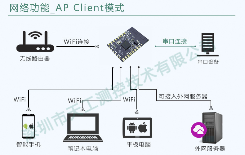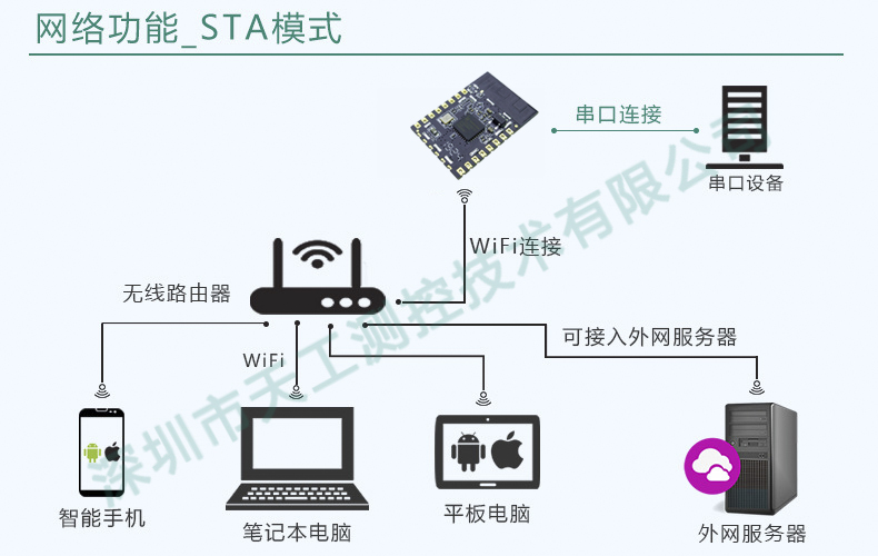 STA模式:UART串口WiFi模块通过路由器连接互联网,手机或电脑通过互联网实现对设备的远程控制。