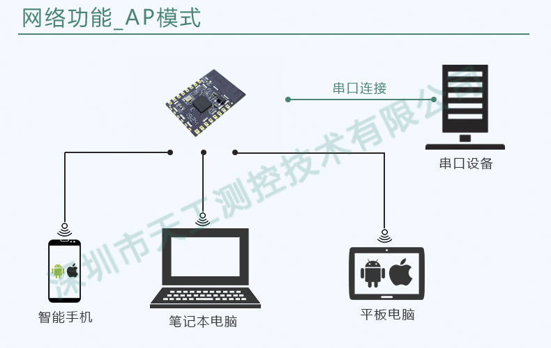 AP模式:UART串口WiFi模块作为热点,实现手机或电脑直接与模块通信,实现局域网无线控制。