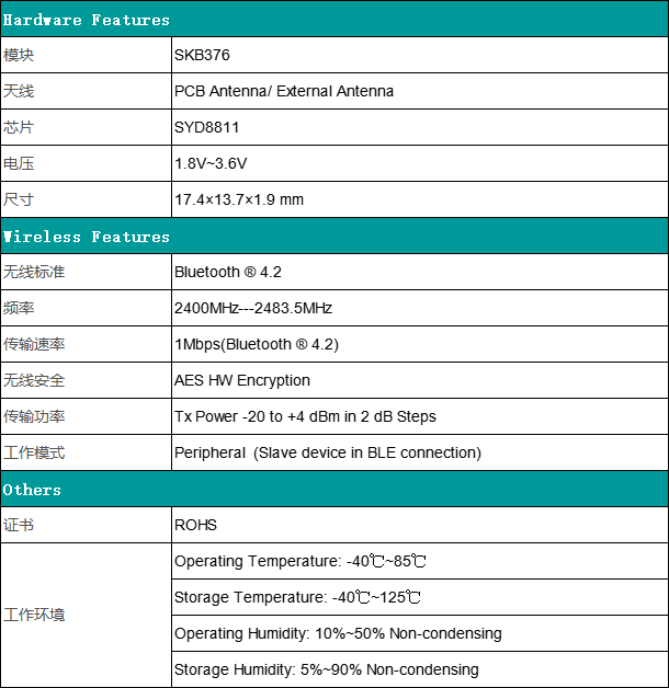 以上即串口蓝牙模块SKB376与串口蓝牙模块SKB369的对比,想了解更多SKB376,SKB369参数的工程师们,可点击产品图片,下载对应模块的产品规格书。BLE4.2蓝牙模块SKB376现已支持送样测试,索样热线:0755-83408210。